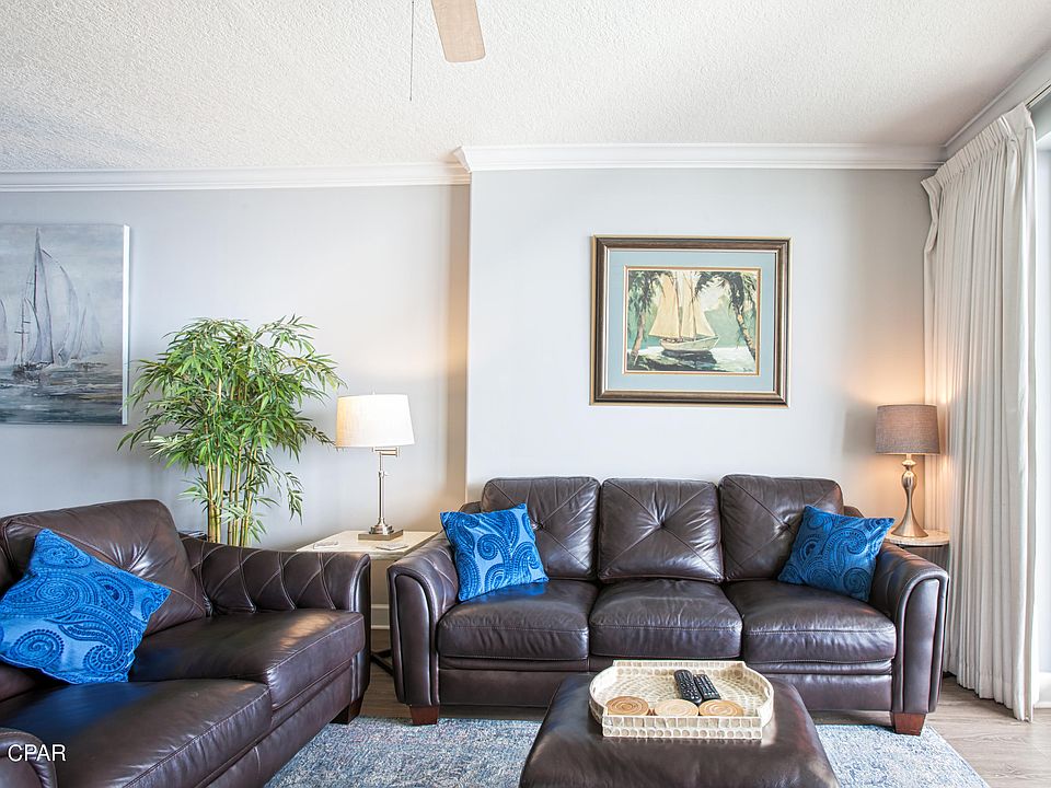 CURRENTLY UNDER CONTRACT, SELLER ACCEPTING BACKUP OFFERS' PENTHOUSE with deeded parking and storage closet. Completely renovated unit available at the most desired location in West Panama City Beach. Currently in the rental program and all future bookings convey. (Current owners manage it and can do so for you too). Upgrades: Combo, stacked washer/dryer 2020. Stainless steel appliances 2021. Hot water heater 2018. High efficiency HVAC system with Honeywell smart thermostat 2018. All original tile and carpet removed (except tile in bathrooms) and replaced with Luxury Vinyl plank flooring 2018. Leather sleeper sofa, loveseat and ottoman, mother of pearl end tables, ''Blue'' guest chair in Living area 2019. Balcony chairs 2021. Ceiling fans in living, dining, and master bed Blackout curtains in living and master bedroom at sliding balcony doors and in guest bedroom. Warranty paperwork on all appliances, A/C, water heater, & furniture available. Property manager voted best on the beach numerous times, 24 hr security, 3 level parking garage below unit w/additional 2 story parking available across street, HOA constantly updating facility. 2 pools located on property, gas grills,workout facility, and literally steps from the perfect white sand beach w/incredible Gulf views. Buyers to verify all important information.