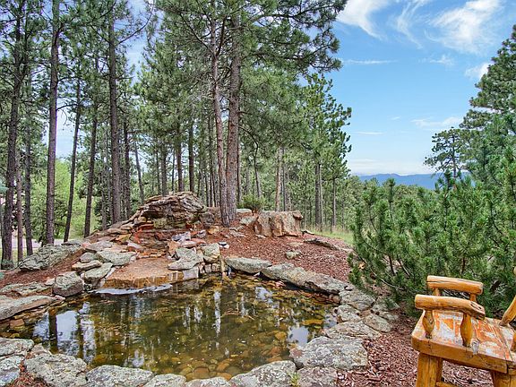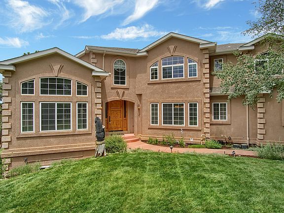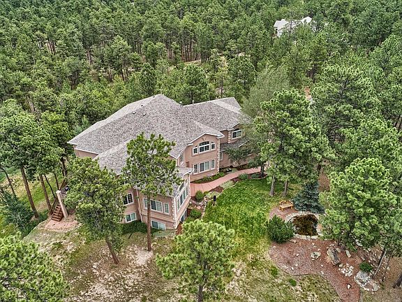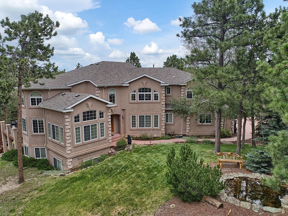 Come explore this beautiful estate on more than 2.5 private acres in Monument. Nestled in the trees, you're welcomed by the stone pond water feature and custom natural wood front door. Incredible floor plan with high ceilings throughout, open living spaces, and a staircase at both the front and rear of the home. Truly grand entry with soaring ceiling, curved staircase, and gorgeous hardwood. Bright office with beamed ceiling, formal living room, and sunken family room with 24 foot ceilings and stone mantle gas fireplace. The heart of the home is certainly this chef's kitchen. With both a dining area and breakfast bar, it also boasts a coffee/bar area, office area, oversized walk-in pantry, butler's pantry, stainless steel Sub-Zero refrigerator, double oven, separate warming drawer, secondary bar sink, huge kitchen island with stainless steel Viking gas range, and slab granite counters.