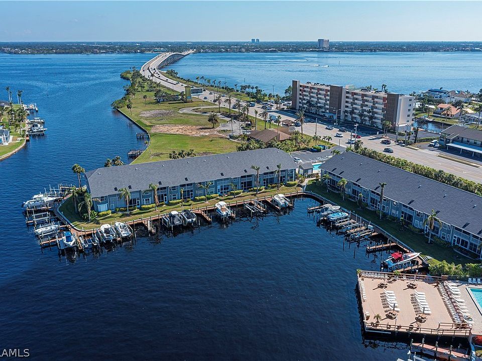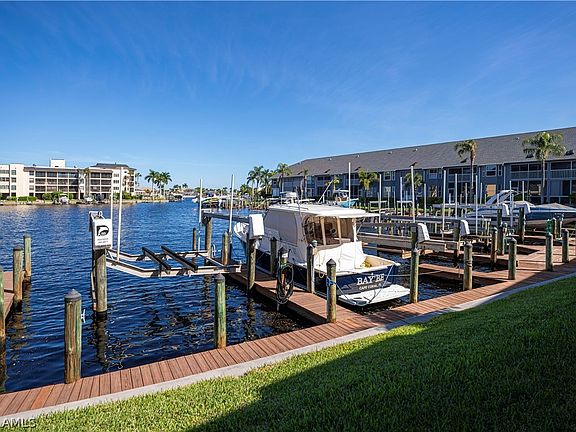 NO Worry's here This Condo development is built like a FORTRESS! No Flooding or damage during Ian, Helene or Milton! Welcome to this stunning 2 BR+den, 2 bath condo where modern meets waterfront living. This luxurious waterfront property offers wide basin water views. As you step inside you are greeted by a feeling of being on the beach. The home comes partially furnished and is decorated with a beach theme. The lanai that over looks the wide basin view is a versatile space that serves as an extension of living area, offering a perfect spot to enjoy the breathtaking scenery while being sheltered from the elements. There is a barn door in the living area when opened has a built in desk area for your computer. The condo comes with a dedicated private boat dock. This condo features quartz counter tops in the kitchen and granite counter top in master bathroom, custom cabinetry, Tile and hardwood flooring, Stainless steel appliances. The A/C is 3 years old. New roof on the building after Ian. No Hurricane Ian damage to the unit. There are hurricane screens on the back lanai that roll up and down manually and the bay window in the master bedroom is high impact glass. Great location near shopping, restaurants. This is a boaters dream location with Direct Gulf Access NO Bridges and short distance to the Gulf.