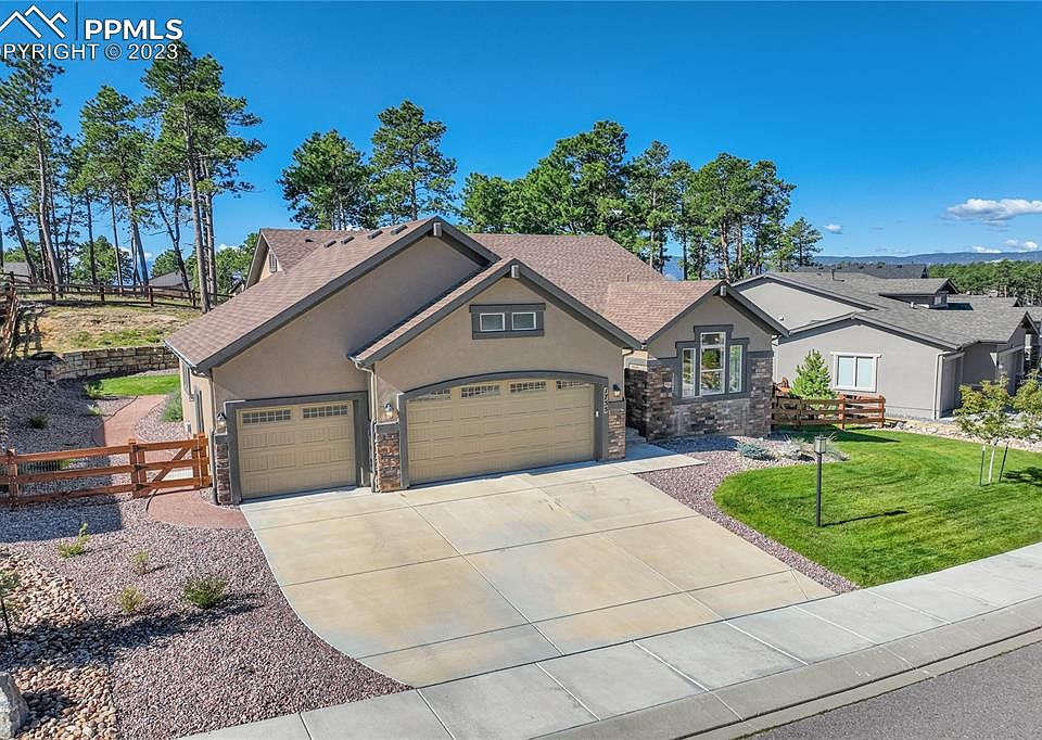 Embody the essence of true Colorado living in this enchanting ranch-style home expertly blending colors + textures to create a timeless, serene aesthetic. Nestled amid towering pines, stunning views + abundant wildlife, this home is extraordinary + the epitome of CO luxury living. Inside, discover an open concept design, plank laminate flooring, soaring ceilings, walls of windows, dovetail soft close doors + drawers, quartz countertops, brushed gold faucetsThe MN lvl flex space is ideal for office/living/play/dining rm, offering flexibility to your lifestyle. Centered in the Greatroom is a gas fireplace w/floor-to-ceiling stacked stone flanked by shelving + lighting on both sides. The Gourmet KIT boasts upgraded MidContinent Cabinets w/42"uppers, a suite of upgraded Stainless Steel Appliances, including a Forno 48" 6-burner Gas Oven Range w/griddle + double ovens, a tile backsplash, spacious Center island, pantry + attached dining area w/walkout to rear patio for outdoor entertaining/living. The owner's retreat is a true sanctuary w/walls of windows, walk-in closet + ensuite boasting dual sinks + a spa-like frameless walk-in shower w/dual shower heads, mud-set hexagon tiled shower pan + bench. A 2nd bdrm, full BA + laundry Rm w/nearby hall tree complete the MN. The lower lvl offers a spacious Fam Rm, 2 add'l bdrms, a full BA + lg. storage Rm w/option of future Junior Suite, providing plenty of space for recreation + guests. Extras: 3-car GAR w/Wi-Fi openers, 58 HERS score, water filter sys, Aprilaire Ventilator, Smart Home Features + more! Outside, this 0.26-acre lot offers a serene escape w/a gas-ready rear extended patio. Situated in one of the most desirable neighborhoods w/open spaces, parks including a new, soon to open, multi-use field Lacrosse/Soccer/Park, community events + trail system that has direct access to Fox Run Regional Park, this home is just minutes from the AFA, shopping + dining + I-25 making commutes to C/S, DEN, military bases + more a breeze!