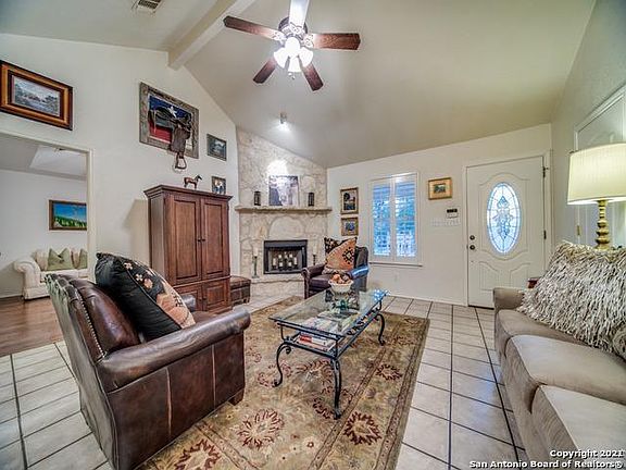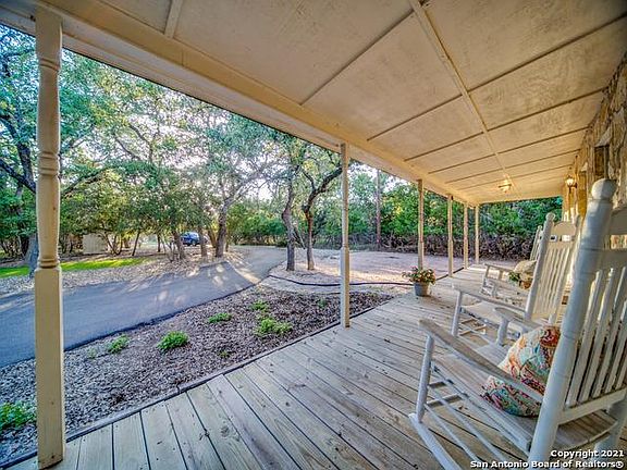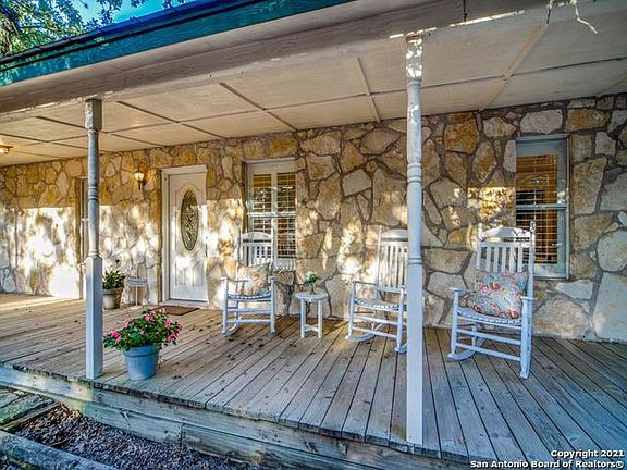 Welcome home to this classic Texas Hill Country Stone Ranch Home with a metal roof on a secluded .81 acre lot with 3 - yes 3 covered outdoor areas! Impeccably maintained home with lovely tile and hand-scraped hardwood floors and a floor to ceiling stone corner fireplace in the vaulted living room. Plantation shutters on every window open to quiet country life with tons of privacy. Porch sit and watch the deer and other wildlife from the 2 long covered decks front and back on the house and a third wonderful detached covered party patio with a ceiling fan, electricity and a huge flagstone patio area. The fenced and heavily treed lot has accent lighting in the trees, a private electric entry gate with remotes, and an exceptional asphalt drive leading to the 2 car garage and house. Rivermont is a premier country neighborhood that boasts great Comal ISD schools and tons of neighborhood amenities - private river/waterpark access to the Guadalupe River, a pool, tennis courts, bbq, basketball, sports court and so much more! The country lifestyle you have always dreamed of...