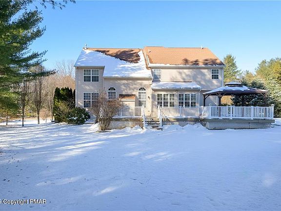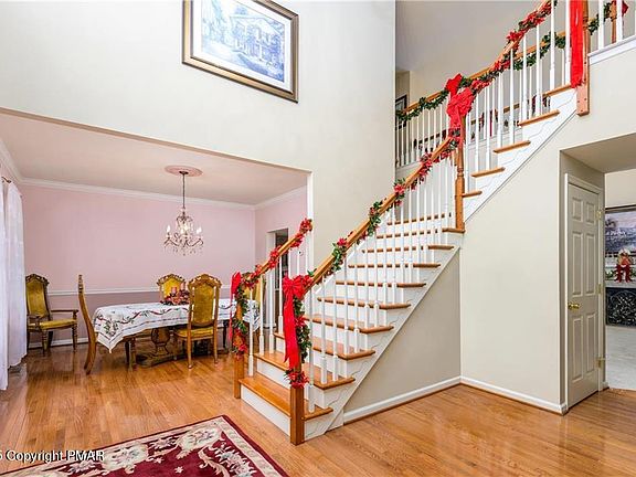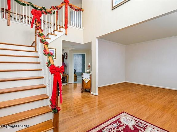 Welcome to this exquisite 5-bedroom, 2.5-bath stone-accented Colonial, where timeless craftsmanship meets modern comfort. Impeccably maintained and exceptionally clean, this home exudes pride of ownership. Step into the grand foyer, where soaring cathedral ceilings and a striking dual staircase create an unforgettable first impression. The staircase seamlessly connects the kitchen and foyer, while the upstairs walkway offers breathtaking views of the open spaces below. The heart of the home, an open-concept kitchen and dining area, features gleaming hardwood floors and is perfect for entertaining. Unwind in the cozy living room with its inviting fireplace, or bask in the natural light streaming into the sunroom, a serene retreat with large windows and direct access to the spacious rear deck. Escape to the luxurious master suite featuring double doors, walk-in closet, spa-like bathroom featuring a Jacuzzi tub, walk-in shower, dual vanity, and custom tile floors. Four additional bedrooms provide ample space for family or guests. Outside, the beautifully landscaped yard includes a large deck perfect for BBQ's and a garden area for green thumbs. Located in a quiet, desirable area, just minutes to Lehigh Valley Hospital, Jim Thorpe, Beltzville State Park, Blue Mountain Ski Resort, and major routes like the PA Turnpike. With NO HOA fees, LOW taxes, and a prime location, this stunning property is a rare find.