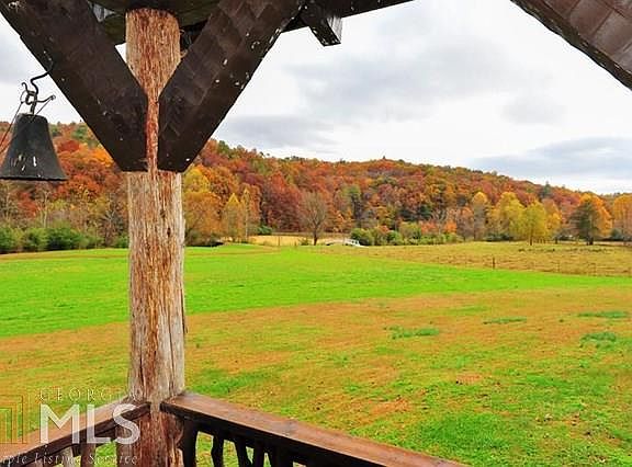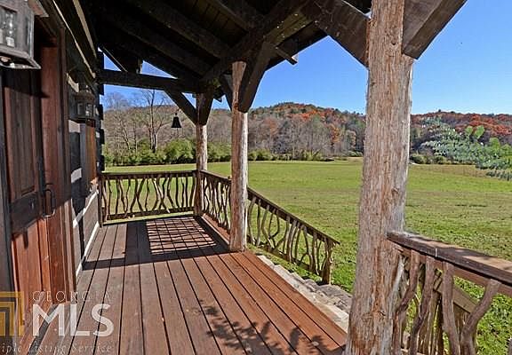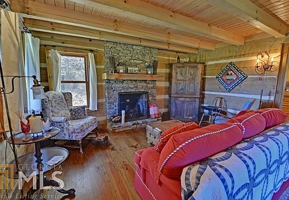 This 1 BR, 1 ba Hearthstone log home sits on 29 acres with approximately 625 ft of frontage on the prestigious Soque River, noted for its trophy trout.A combination of pasture land & wooded forest set the stage for this charming getaway.The cabin's over sized timbers with dovetailed corners & chinked siding bring memories of times when life was simple.The front door is a work of art made of solid heart pine with mortise and tenon joints.Living room/dining room combo with stacked stone fireplace.Kitchen has granite counter tops, a Kohler farmhouse sink, travertine back splash, custom cabinets & the (fully electric) Elmira reproduction pot belly stove. Upstairs bedroom has vaulted ceiling, exposed beams and a dormer window.