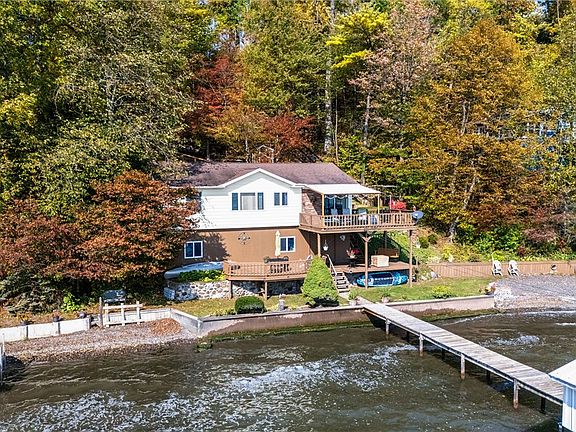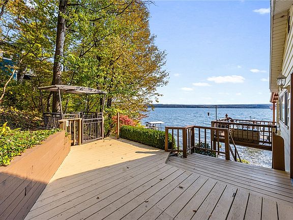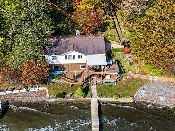 Cozy year round cottage with 60 years of labor and love! This Seneca Lake gem boasts a private 100 feet sprawling shale beach buffered either side by woods, panoramic views, permanent dock, expansive outdoor decks for family entertainment, and plenty of parking. This property features a heated and insulated garage on a wooded lot. Gentle steps lead to the lakefront home or take an easy ride on the state of the art covered tram system. Inside the home you'll find 2 bedrooms and 1 full bath, a wood burning fireplace, and updated custom oak kitchen with granite countertops. Walkout basement with washer, dryer, wash tub, refrigerator, freezer and cedar closet is ideal to use as a bar area or to store your water skis and lifejackets. Family selling do to changes in their health. Selling mostly furnished minus some personal possessions. Do not sleep on this Seneca Lake once in a lifetime opportunity.