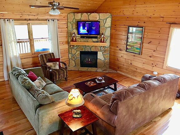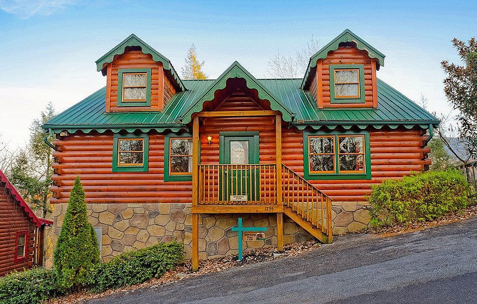 FOR SALE $720,000: INCOME PRODUCING 3 BEDROOM 3 BATH CABIN IN GATLINBURG, TN WITH BREATHTAKING MOUNTAIN VIEWS, THEATER ROOM, and RESORT POOL, BEING SOLD FULLY FURNISHED AND TURNKEY! This ideal 5 star log cabin is perfectly located near The Great Smoky Mountains National Park and all the city of Gatlinburg has to offer. Nestled in Mountain Shadows Resort that offers outdoor swimming pool, playground and pavilion for owners and guest has low HOA fees, city water and sewer. Interior boasts a true cabin feel with wood covering floors to walls to ceiling! Main level features an open concept living room /kitchen/ dining area large enough for your entire party to sit comfortably with cathedral ceilings and a lovely stone gas fireplace and TV in living area. The spacious kitchen- fully equipped with pots and pans, dishes, utensils, small appliances, and dish washer- has brand new refrigerator, stove and microwave. Easily accessible utility closet with washer (replace 2021) and dryer. Tastefully decorated throughout with a mixture of log-cabin charm and modern amenities. The master suite is conveniently located on the main level and two bedrooms on lower level. ALL 3 BEDROOMS ARE PRIVATE each with attached full bathrooms having tile floors and tub showers, large closets, and their own French door to access back decks to enjoy the serene and peaceful woods setting. As you walk down the stairs to the lower level, to your left you'll be greeted with an impressive theater room with 65” screen TV (purchased 2020), surround sound and comfortable theater style seating and to your right a game area with foosball table for hours of entertainment. Outside on both levels of the covered decks enjoy sitting back in a rocking chair while you take in the fresh pine forest setting and the mountains view in the distance. Main level deck is ideal for entertaining with a 6 person hot tub, plenty of seating, and no-fuss grill area that is hooked up to the natural gas so no fear of running out of propane or being left with a charcoal mess. The curb appeal on this recently stained and painted log cabin topped with a green tin roof, gingerbread trim and enough parking for 3 cars is sure to impress! This is a must see! **Buyer is requested to honor existing bookings for 2021 time period**