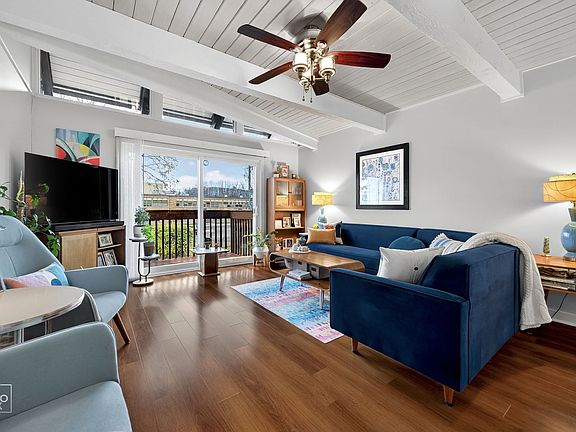 This exceptional home has been meticulously remodeled and updated, offering outstanding condition throughout. Designed with a contemporary aesthetic, it features warm wood accents and high-quality finishes throughout. The renovated kitchen includes attractive wood cabinetry, a glass backsplash, wood laminate flooring, and wall-to-wall pocket doors that open to the dining area and front balcony. The spacious living room, located on the same level, is enhanced by whitewashed stained, cedar planked and wood-beamed 10' ceilings and provides access to the rear balcony overlooking the greenspace, as well as a remodeled powder room and laundry area with washtub. The master bedroom offers cathedral, whitewashed cedar planked and beamed ceilings along with a walk-in closet, while the second bedroom includes extensive closet space. Mid-century modern elements contribute to the property's overall visual appeal. Additional amenities include both front and rear balconies, a large family room with sliding glass doors opening to an aggregate concrete patio and backyard, ample storage with a family room closet, a walk-in closet off the main entrance, and a built-in closet in the garage-providing three storage spaces on the ground level. Recent improvements consist of a furnace and washer/dryer (2016), water heater (2017), refrigerator, stove, and wood laminate flooring throughout the lower and first-level living areas (2021). Exterior enhancements include new decks, railings, light fixtures at the front of the building (2023), parking lot upgrades (2024), and exterior painting (2021). Conveniently situated off Rand Road at the rear of the complex, this residence is five minutes from the Metra train station, shopping, dining, parks, expressways, and just ten minutes from O'Hare International Airport. Residents have easy access to the Des Plaines River Trail, offering 28 miles of scenic pathways. This end unit occupies one of the most desirable locations in the complex-not on Rand Road and adjacent to green space. Homes within this development are rarely available. Early viewing is highly recommended to avoid missing this opportunity.