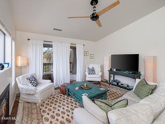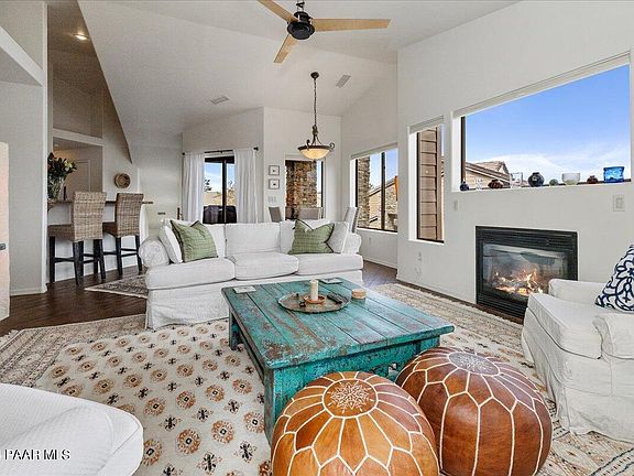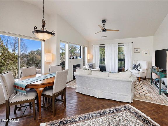 Nestled within the exclusive gated enclave of The Villages at Hassayampa, this condo offers luxury living with captivating views of the dramatic Thumb Butte, the Capital Canyon golf course against the backdrop of the Bradshaw Mountain range, and a row of Ponderosa Pines strategically placed for privacy. The light and bright main living area features a beautiful open-concept great room with high volume vaulted ceilings, gas fireplace with windows surrounding it and access to one of the two elevated decks. Inset from the great room is the dining area, perfect for entertaining. The staggered-height ceiling ideally complements the kitchen and gleaming granite countertops, providing an elegant touch. The generous master suite features vaulted ceilings adorned with decorative niched shelving,
