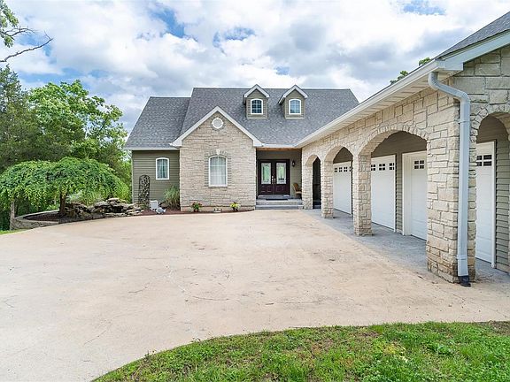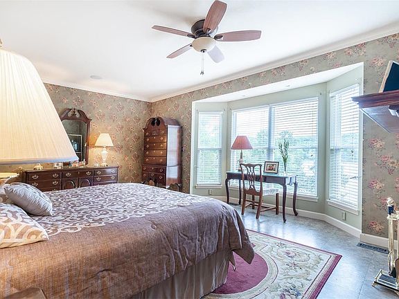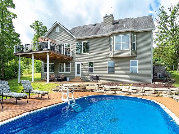 Waterfront lot with a boat slip and dock, composite deck, above ground pool with a deck all around it, stamped concrete patio, koi fish pond, stone columns, 3 car heated side load garage with openers and all finished, alarm system. 4 bedrooms, 2.5 baths, family room with a wet bar and cabinets, surround sound, and gas fireplace. The bay window in the master bedroom overlooks the water and also feature another gas fireplace. Living room with wall of windows overlooking the lake. The kitchen has custom cabinets, center island, breakfast bar, pantry, ceramic backsplash, stainless steel appliances, granite and solid surface countertops, trey ceilings, crown molding, 20x18 all concrete room for storms or man cave. The neighborhood has a golf course and lakes to enjoy. Hillsboro Schools.