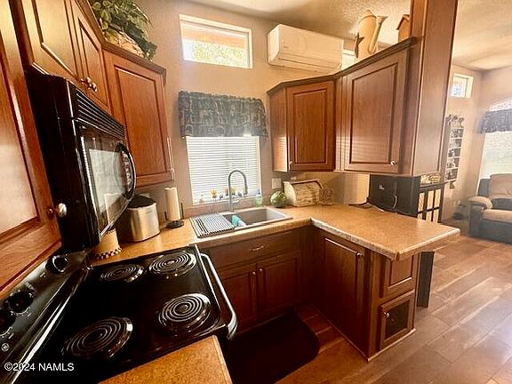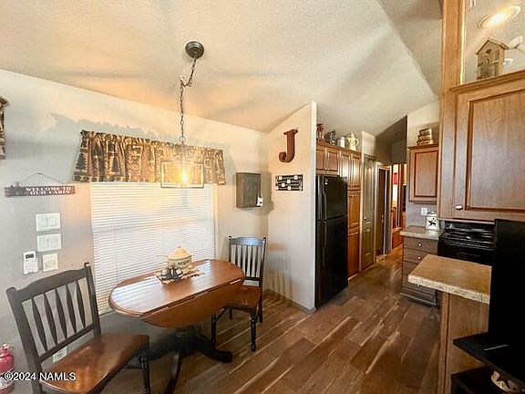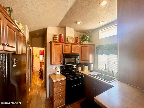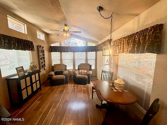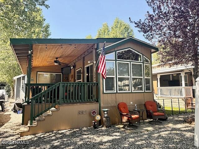 Escape the heat and come see your updated 2 bedroom 1 bath home in the desirable community of Munds Park! Nicely decorated, spacious home comes furnished, has A/C and Heat, granite sink in kitchen, vinyl plank flooring, new toilet, newer interior, exterior paint, all electric, covered patio, 3 sheds and a deck box in the back, away from the freeway and so much more! The park is open seasonal only. April 1st thru Oct.31st. LAND LEASE is 806.00 a month from April 1st thru Oct. 31, ONLY. Community pool, jacuzzi, laundry included. No rentals . It is walking distance to the well- known Pinewood Country Club and close to the national forest, lake, hiking, biking trails, utv trails, park, restaurants, convenient store and more.Come see your new, little home in our neck of the woods!
