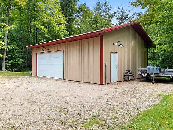 NEW PRICE! A beautiful bright gem set on 2.5 wooded acres. This 4-season home has a sun-drenched deck for enjoying the wildlife. The kitchen has hickory cabinets and an island with seating and all appliances. There is a large bathroom with storage cabinet and stackable washer/dryer. The primary bedroom is on the first floor, and a spiral staircase to the loft with bed. Includes a sofabed in the living room. The garage is newer and will accommodate all your toys. Come and enjoy the lakes (the Horn Lake boat landing is nearby)!