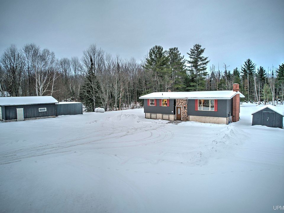 Discover this beautiful 3-bedroom, 1-bathroom home on 9.84 acres on Skanee Rd! This home was redone down to the studs 10 years ago, including the heating system, central A/C, plumbing, and more. The full basement is a blank canvas, ready to be finished for additional living space or storage. The property features a detached 2-car garage with convenient access to two attached storage containers, offering endless possibilities for hobbies or storage needs. Backed up to public land, this property is a nature lover’s dream, with tons of space to explore and enjoy the outdoors. Located less than 10 minutes from L’Anse, you’ll enjoy the perfect combination of privacy and accessibility. Whether you’re looking for a peaceful retreat or a forever home, this property offers it all. Don’t miss out on this unique opportunity – schedule your showing today!