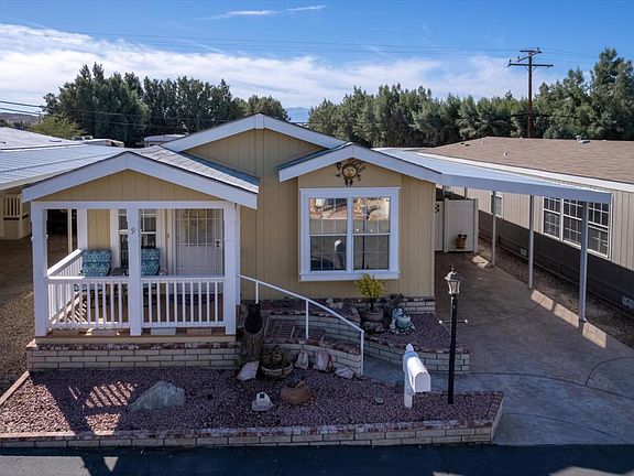 This 2006 -3 Bedroom 2 Bath double-wide beauty features an open floor plan with vaulted ceilings, a spacious living room, beautiful flooring (no carpet) with plenty of natural light throughout. The kitchen has been updated all appliances will be included (gas range with convection oven, microwave, refrigerator, and dishwasher, washer/dryer).The master suite has a walk-in closet and added touches in the master bath (double sinks, large tub and walk-in shower). The seller has put extra care and attention to details into making this home ''move-in ready''. You'll also fall in love relaxing in the covered front porch area. A large shed is also included. The property will NOT include the vinyl gate in the carport area. Desert Palms is an All-Aged Community that offers amenities such as a pool/spa, clubhouse, kids' playground and dog park - which are all in proximity. Additionally, this community is conveniently located near Palm Springs. Space rent is $575/m for new residents. Call now to make an appointment!