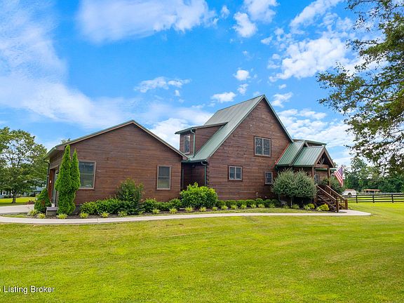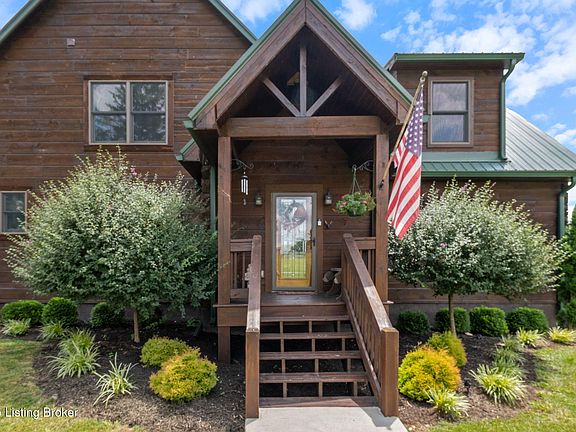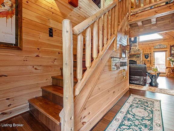 Welcome to 17558A Aiken Rd — a stunning custom log cabin nestled on 3.8 private acres in East Louisville. Built in 2019, this 5-bedroom, 3.5-bathroom home combines rustic charm with high-end finishes throughout. The heart of the home features a breathtaking floor-to-ceiling stone fireplace in the great room, complemented by rich hardwood floors across the main and second levels. The kitchen is a true showstopper, with hammered copper sinks, a matching copper range hood, and stone accents carried into every bathroom shower.