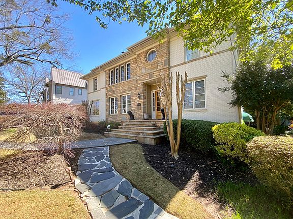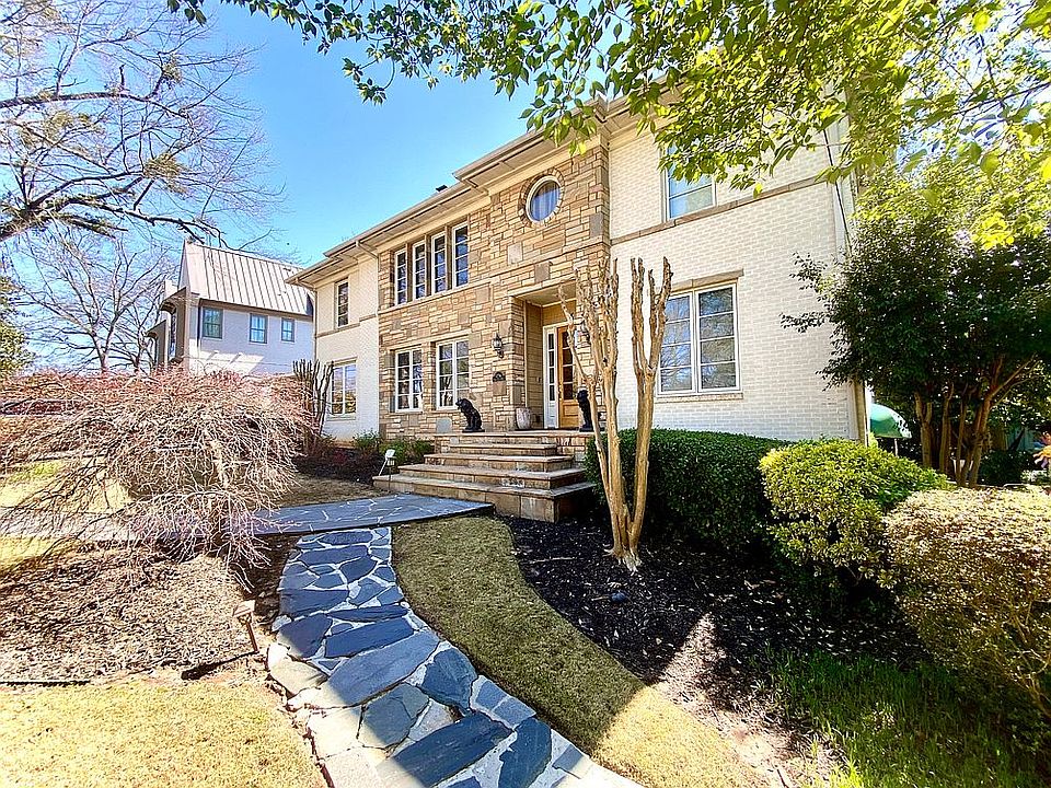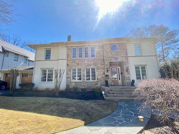 Beautiful Large BRIGHT Home with Brick Veneer, Decorative Sand Stones and Long Eaves Roofline. Completely renovated in 2005 following an original plan in the style of Frank Lloyd Wright American classic modern architecture, designed by renowned architect John Wright who created several beautiful homes in Midtown Atlanta and Sherwood Forest. The home is currently occupied. Please do not disturb occupants. Contact seller for appointment. Description of the home: After walking up the impressive front stoop, enter a large bright front living room with fireplace and 10-foot ceilings found throughout the house first floor. The eye is attracted to a diagonal ‘Southern Staircase’ in oak wood and metal banister matching the real oak hardwood floor. A crystal chandelier is the centerpiece of the room… Walking toward the back you’ll enter the rear living room/large den, with floor-to-ceiling windows in a rotunda shape. Great room to hang out as a family, watch a movie, or watch the kids in the swimming pool. Double French doors open to the rear stone patio. This room also features a wet bar with smooth granite countertop. On the side is a media closet where the five networks of the house originate (internet, cable TV, sound, telephone and security). The kitchen with original pinewood floors has a large counter that can sit three people. Oversized double French doors overlook the backyard and bring in plenty of natural light. Double oven and fridge with French doors. Pro-quality gas stove with a hood that fans out. The laundry room/mud room with doors to the two-car garage, has high vaulted ceiling. This area is great as a workshop with windows all around or it can be used as a breakfast room. It has a door with a hole for a small dog or cat to go on their own to the securely fenced backyard. Next is the dining room with large double windows facing the front yard. The room can easily accommodate 8 guests and has served more at times. (Please note the star-shaped ceiling light in the photos will not remain in the house. It will be changed for another ceiling light, TBD.) Two nice size bedrooms #1 and #2 are on the first floor, each with two large windows. #1 has an attached full bathroom, while #2 has a detached full bathroom decorated in a Gustav Klimt style with diamond pattern red marble tiles and a double shower. This bathroom also has a convenient door to go to the pool and take a shower before re-entering the house. Walk up the central staircase to arrive in the upstairs master suite. Master bedroom (#3) has ample space, vaulted ceilings and two round windows facing the back of the house. Adjacent yoga or music room with floor to ceiling windows also in rotunda shape. Master bathroom has a jacuzzi bath; (it could be changed). Double vanities with two walk-in closets. One closet has a powder desk with makeup lights. Toilet room with bidet. Bathroom closet has hookups for stackable full-size washer and dryer. Upstairs living room or open office with tall round arch and 4 windows overlooking the front of the house. Two bright bedrooms (#4 and #5) with plush carpet and a jack-n-jill bathroom with shower bathtub. Two linen closets in the bathroom, or use one for sound system. Basement level has a fully livable private suite with its own separate entrance, kitchen, cozy living room, large bedroom with three windows, a full bathroom, and its own laundry room. Private patio decorated in a beach style. Basement also has a large room already wired for movie theater or use as an exercise room with a light well. Sound system throughout the house. 6 zones on first floor and terrace level. 4 zones upstairs. House is already wired for internet in every room, coax cable tv, telephone, security, and ceiling sound speakers with Nuvo wall panel controls.