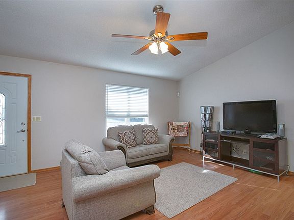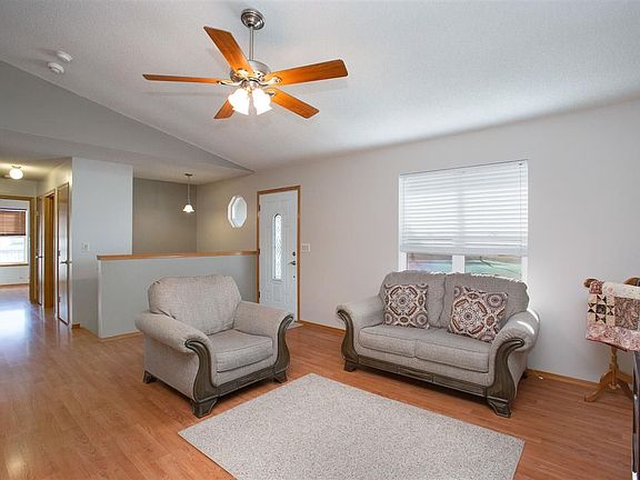 Immaculately maintained and updated throughout, sure to please the pickiest of buyers. Yard maintenance has been professionally maintained over the years and has nice landscaping, sprinkler system, and new concrete patio. Mostly fenced yard, just needs one front side to be 100% fenced. Open floorplan with vaulted ceiling, kitchen with eating bar, pantry, and stainless steel appliances all stay. Main floor has wood laminate flooring throughout. Master suite with double vanities, tub/ shower. Main floor laundry room. Basement has been nicely finished out with new carpet, tile floors, large family room with built ins, flat mount tvs & mounts will stay with the property. Third bedroom with daylight window and new bathroom with new vanity, fixtures, flooring. Still lots of storage space with a separate storage room and mechanical room. Fresh paint inside and out, new ceiling fans, three year old hot water heater, and new garage door opener. Located just a block from Mulvane High School with NO Specials.