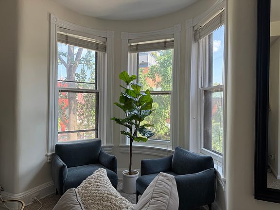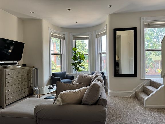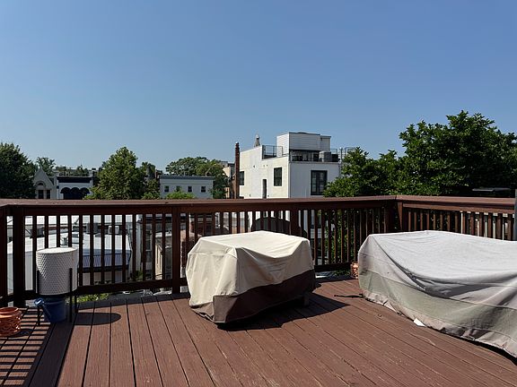 Available August 15th! Perched high atop a perfectly preserved Swann Street rowhouse, this two-floor apartment with private roof deck showcases a seamless pairing of old world charm and modern convenience. Encompassing the entire third and fourth floors, this apartment features an updated and expanded kitchen (granite counters, stainless steel appliances), original hardwood floors, period fireplace with Victorian surround, washer & dryer, and oversized windows providing tons of natural light. Whether you choose to dine in one of the two gracious round 3-window bays, or relax in your sunlit southern facing bedroom, Unit 3's ample exposures will leave no sun lover wanting. The large bedroom provides ample space for a king sized bed. Ascend to your treetop oasis, a large private deck with commanding views across Dupont Circle and beyond. Sorry, no pets. Water, cable and high speed internet are INCLUDED, so one call to Pepco and you're all set to move in and make 1756 Swann your new home. Blocks to everything you need in Dupont for a truly walkable lifestyle. This particular block of Swann Street is known for its picturesque fall foliage and annual Halloween block party. Owner pays for water, cable, and high speed internet. Tenant pays electricity. Sorry, no pets.