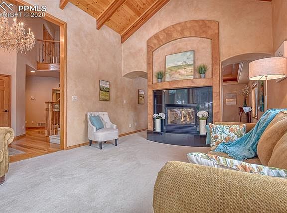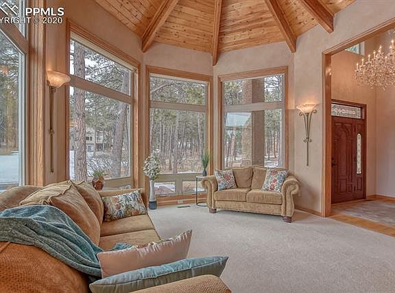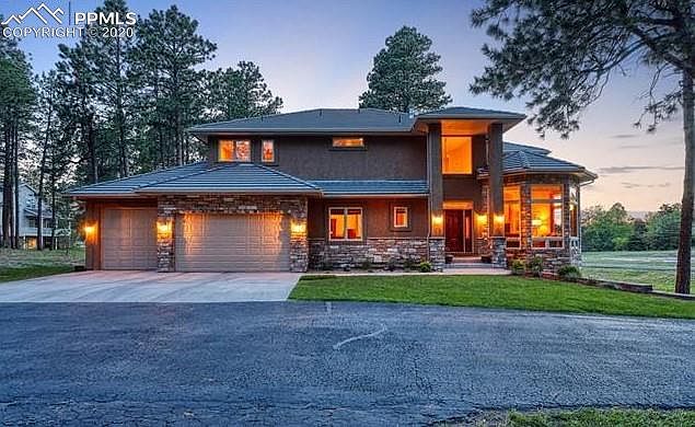 Majestic home located in Higby Estates. Located only 10 minutes to I25 access and local restaurants and shopping and 5 minutes from Lewis Palmer High School, this beautiful two-story home will surpass all your needs. You are greeted with a stunning crystal chandelier leading the way to the great room that has a custom-designed pine cathedral ceiling. Guests can be warmed by the double-sided fireplace while taking in the views that surround this 2.51-acre lot. A well laid out open kitchen includes a center island, information center, stainless steel appliances, a large eating area with hickory cabinets, and floors. The adjoining family room walks out to a large deck with views of the front range. Main level includes an office and laundry room. This house is wired with stereo speakers on the main and upstairs levels including the deck and master bedroom and bath. Master bedroom includes a wet bar, double-sided fireplace, jetted tub and porch with vews of the front range. Bottom level has a theater area with a 3-D Epson projector and screen and several built-in speakers. House includes 2 furnaces, 1 a.c. unit, 2 water heaters, a Whirlpool whole-house filtration system, an Enpress LLC water neutralizer system, and concrete tile roof.