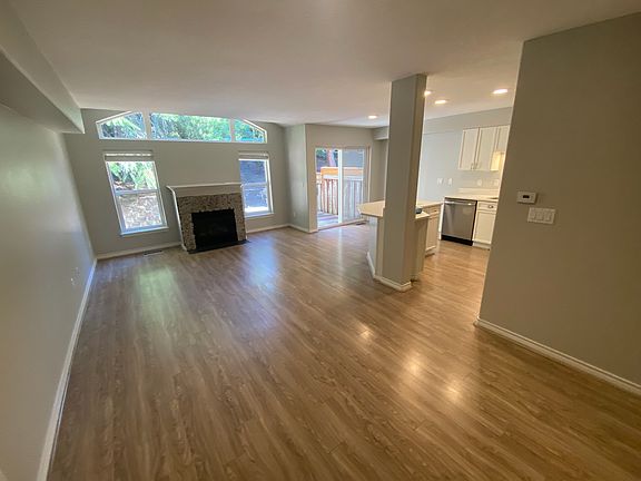 Light & bright townhome in sought after Woodhaven with pathways, trails, parks and close to YMCA. Spacious entry, great room living on the main with a wall of windows surrounding the gas fireplace. Updated kitchen with quartz counters. Main bedroom with double walk-in closets, bath with double sinks, vanity seating and tub. Upper utility room - washer and dryer. Relax on your deck in the backyard. New paint inside and carpet. Minimum one year lease Application Fee: $55.00 per person over age 18 Proof of renters' insurance required prior to move in Tenant paid: utilities: electric, gas, sewer, water, garbage Air Conditioner Washer and dryer upstairs No Smoking anywhere on the premises