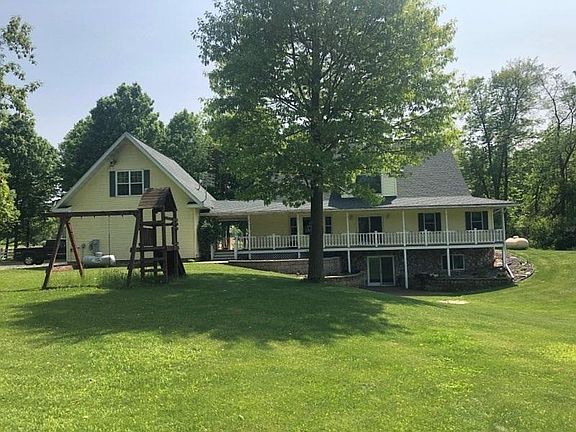 Discover this stunning 4-bedroom, 4-bath country home! Featuring soaring vaulted ceilings and a floor-to-ceiling stone fireplace in the spacious living room, this residence exudes warmth and elegance. Throughout the home, you'll find beautiful hickory and ash woodwork complemented by durable tile floors. The fully finished basement offers a welcoming family room with a large bar area and a walkout patio, perfect for entertaining. Custom-built cabinets enhance the kitchen and other spaces. The master suite boasts a walk-in closet, a full bathroom with a soaking tub and a convenient laundry chute, all with breathtaking views. An expansive attached garage connects to a fully covered wrap-around deck, providing easy access. Above the garage, there's an in-law suite complete with a bathroom, kitchen, and open-concept living area?ideal for guests or extended family. Has a classic wood-sided barn used for horses, along with partial wood fencing. This truly is a must-see property!