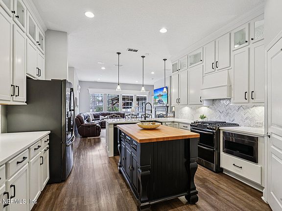 Welcome Home to your Entertainer's Dream! Nestled on a quiet tree lined cul-de-sac street in highly sought after St. Johns Golf and Country Club, this intensely updated pool/spa home boasts stunning golf course views, with a courtyard entry and spacious 3 car garage. The interior opens to the inviting foyer overlooking both the formal living and dining rooms, flowing seamlessly through French Doors into the fully renovated chef inspired kitchen, no detail was spared. The elegant casual dining area, and kitchen overlook the cozy family room with gas fireplace, all of which enjoy a view of the pool, spa, expanded covered entertaining area, all screened in for your enjoyment. Primary bedroom is on the main floor, four additional bedrooms include a private ensuite with direct pool access, perfect for guests or as a dedicated pool bath. Enjoy peace of mind with a new roof, pool resurfaced 2018, all new pool equipment. Custom lighting and elegant millwork throughout.