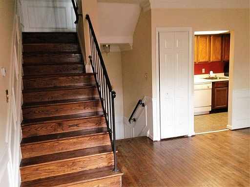 A two level one bedroom, one bath apartment located in the Dupont Row Condominium. Enter apartment into small foyer. Two steps up is the living room/dining room (15x14) combo with hardwood floors and wood burning fireplace. Fully equipped kitchen includes electric range, double oven, refrigerator, dishwasher and garbage disposal. Second floor includes bedroom (13x12) with hardwood floors and a full bath with laundry closet that has a washer and dryer in it. One outdoor parking space is included in the rent.