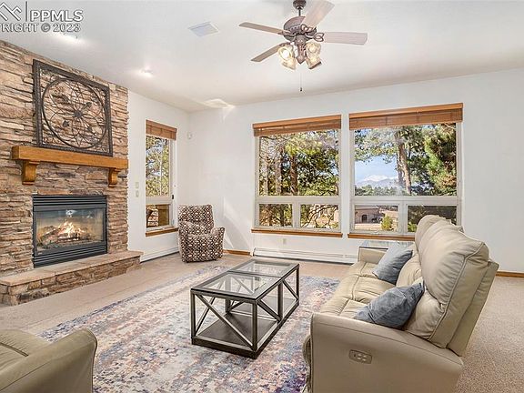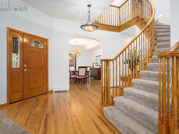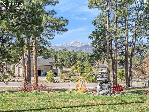 Beautiful custom home on private lot in coveted Higby Estates neighborhood. Stunning views of Pikes Peak from all three levels. Amazing location w/ 2.51 acre lot w/ mature trees for privacy & great areas for outdoor living. Located minutes from shopping, award-winning school district, & other conveniences provide the perfect balance of private living while being closely accessible to common amenities. Walk through the front door into the open floor plan w/ the family room & kitchen off to the right, formal dining room to the left, & circular staircase. Large kitchen boasts hickory cabinets, high-end stainless steel appliances (Bosch, Kitchen-aid, Viking), a large pantry & lots of room for cooking/prep. Spacious nook off the kitchen opens directly to the half-covered newly renovated deck w/ outdoor TV and grill perfect for outdoor living. The spacious dining room is great overflow for large gatherings. The oversized laundry opens directly to the 3-car garage. Continue up to the private master suite w/ gas fireplace, sitting area, & access to the expansive upper deck. The five-piece master bath complete w/ steam shower opens to the large walk-in closet. The upper level has a great office w/ built-in custom shelves & access to the deck perfect for taking in breaktaking views of Pikes Peak. Second upstairs bedroom complete w/ full bath conveniently across the hall. Downstairs has great living space & plenty of room to entertain w/ a wet bar, game area, & space for large pool table. Basement also boasts two additional bedrooms complete w/ a full bathroom . Spacious utility room has plenty of room for storage and is easily accessible. New well pump, pressure tank, & zone controls installed for radiant heat system. The electric dog fence comes w/ one collar. The whole house including both decks is equipped w/ Niles speakers. Very well maintained, w/ new interior paint. Great outdoor space as well as large windows & decks to capture magnificent views of America's Mountain!
