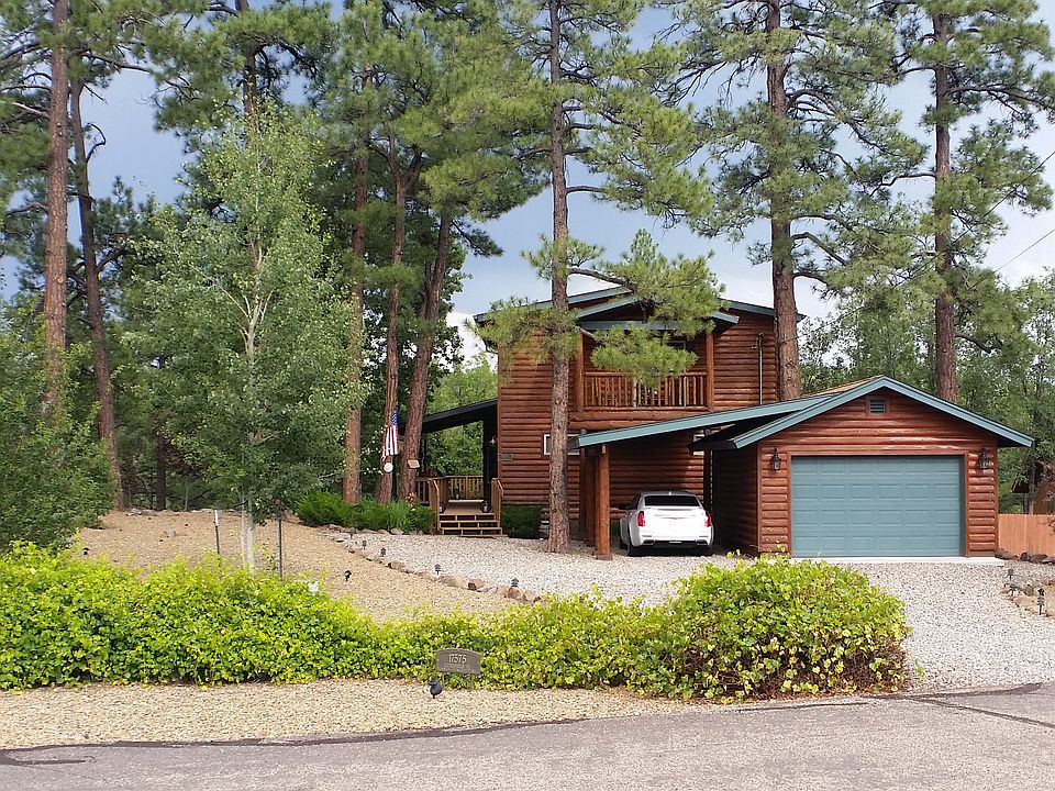Beautiful log cabin on a spacious 3/4 acre parcel with over-sized deck with views of Munds Canyon. Amenities include vaulted tongue and groove wood ceilings, gorgeous rock fireplaces in family room and master bedroom, a chalet-style great room, east/west orientation, two-car garage and covered carport and a storage basement. Call 602.692.7446 for more details.