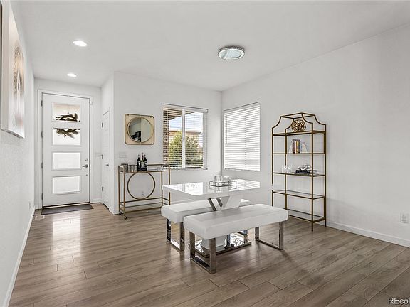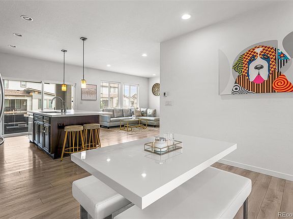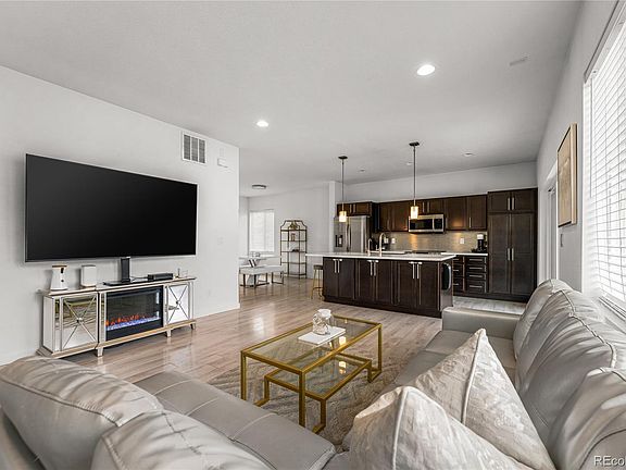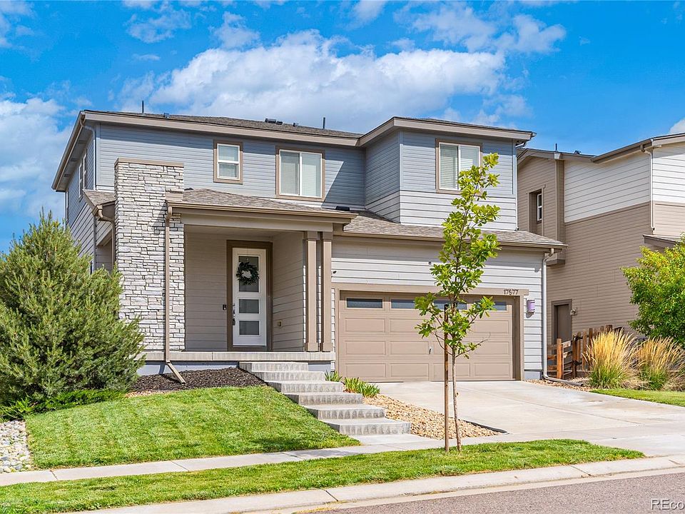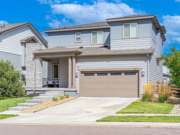 BUYER'S LOAN WAS DENIED SO WE'RE BACK ON THE MARKET! Step into contemporary living with this stunning two-story home, blending a modern design and smart upgrades with comfortable spaces. Featuring 3 bedrooms, 3 bathrooms, a versatile loft upstairs, and a rare finished basement with egress window and roughed-in plumbing, this Reunion home is ideal for those seeking both style, functionality, and a move-in ready place. The main floor boasts an open-concept layout, seamlessly connecting the bright living room, convenient dining area, and gourmet kitchen (including newer Samsung appliances installed in 2021)—perfect for entertaining or quiet family nights. The main floor also includes a half bath and access to the two car garage. Head upstairs on the newly carpeted stairs (Aristocrat carpet) to the thoughtfully designed 2nd floor where you'll find new flooring, the primary suite with ensuite bathroom, a loft, laundry room, two other bedrooms, and an additional full bathroom. The large primary suite includes a walk-in closet, separate toilet room, large shower, and double vanity. The finished basement offers endless possibilities—whether you need a media room, home gym, or want to add a bathroom. Outside, the covered back patio invites you to relax and enjoy Colorado’s beautiful weather year-round. There's a new privacy wall as well as retractable privacy screens. The front and back yards are nicely landscaped and a great size for the family, guests, and furry friends! If you want walkability while living in the suburbs, this is the perfect neighborhood for you. You're steps away from the elementary school, Reunion Coffee House, the pool and clubhouse, and local parks and trails. Other upgrades in the home include new blinds upstairs, new trees (front and back yard), backyard sprinklers, Honeywell Smart Thermostat, outdoor patio privacy fencing, new sod, security system and doorbell Camera and new interior paint.
