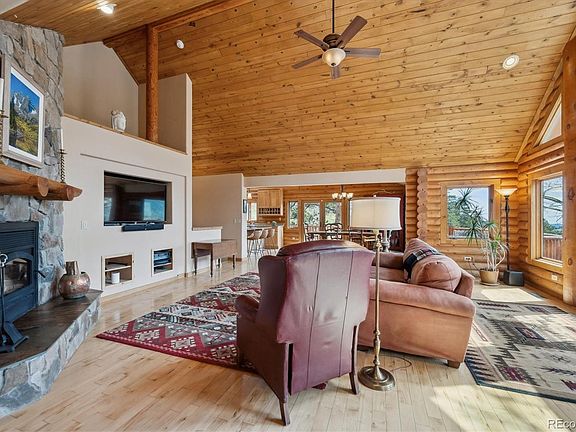 Live the Colorado mountain lifestyle in this beautifully maintained log home, thoughtfully designed to balance rustic charm with modern comfort. Positioned to capture sweeping views of protected Denver Mountain Park land and twinkling city lights in the distance, this home is a peaceful mountain retreat that doesn’t sacrifice convenience. The great room welcomes you with vaulted tongue-and-groove knotty pine ceilings, a wall of windows, and rich hardwood and slate floors, all bathed in natural light. While the log construction offers classic mountain warmth, thoughtfully placed drywall adds brightness and balance throughout the home. Enjoy ideal main-level living with a spacious primary suite that opens to a private deck—perfect for morning coffee or stargazing. The attached home office is bright and inviting, filled with natural light. A second main-floor bedroom with its own en-suite bath provides a private space for guests. The kitchen features skylights and a walk-in pantry with plenty of storage and room for a chest freezer. Step outside to the expansive wraparound deck for al fresco dining or a soak in the hot tub under the stars. Downstairs, the finished rec room is ready for games, movie nights, or quiet relaxation. The exterior is in great shape, the asphalt driveway was recently sealed, and the home shows a history of thoughtful care and maintenance throughout. Located in Clear Creek County, you'll enjoy lower property taxes while still being just minutes from all that Evergreen has to offer—shopping, the rec center, downtown charm, and seasonal fun like ice skating and summer concerts at the lake. And when adventure calls, you're only 30 minutes from Downtown Denver and an hour from world-class skiing in Summit County. Don’t miss your chance to own this one-of-a-kind mountain retreat—schedule your private showing today and start living the Colorado lifestyle you’ve been dreaming of.