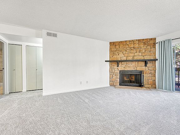 As you enter, you'll be greeted by a spacious ground-level living room featuring a stone fireplace and a sliding glass door that opens to the private patio. Adjacent to the living room is the dining area and the kitchen, equipped with an oven, electric stove, microwave, refrigerator, and dishwasher.