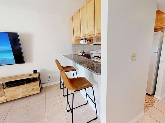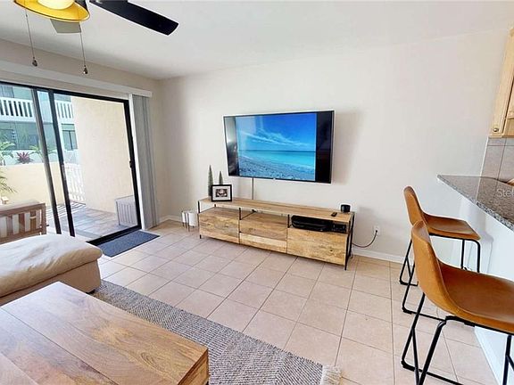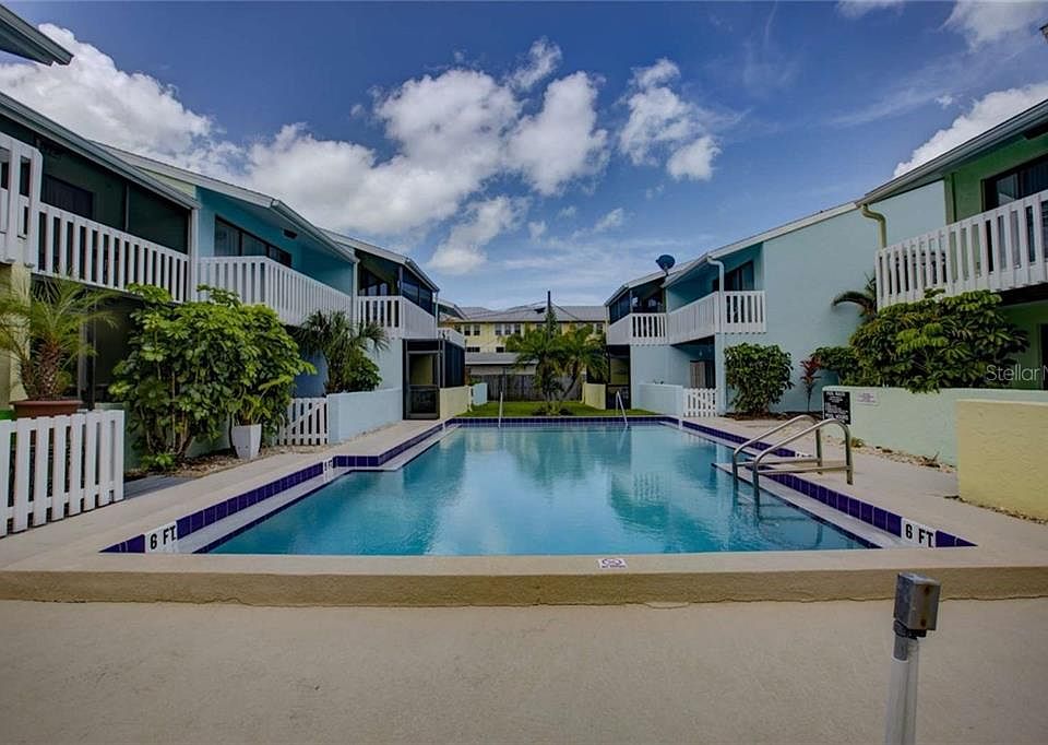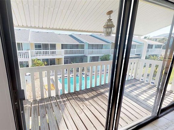 Available for season! Stay in this lovely 2 bedroom condo located less than a mile from spectacular Crescent Beach access #12. Siesta Key Village with all it's great restaurants and shops is a short bike ride or super short drive over the South Bridge which drops you onto Siesta Key Village. This is the place for you! Perfect for couples who are looking to get away but not be part of the busy hustle and bustle of the typical beach rental. With 2 assigned parking spots right at the front door, this lovely townhome will feel like home from the moment you walk inside the door. Enter into the dining space that accommodate 4-6 adults (Bench seat is on its way), sliding doors lead out to the front patio (new sheer draperies are on their way). The living room is tastefully decorated with a large corner sofa with ottoman, ceiling fan, and 65" flat screen Smart TV for enjoying those evenings at home. Enjoy a snack at the breakfast bar for two with cabinets above that are accessible both in the kitchen and at the breakfast bar. Sliding doors (new sheer draperies added) open from the living room to the large, open lanai with seating for several people including a swinging chair and great views of the community heated swimming pool.