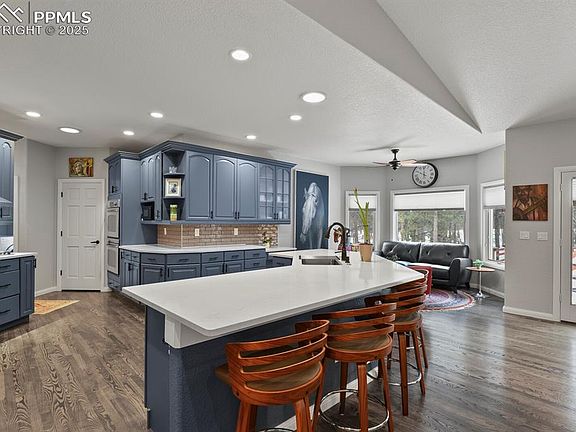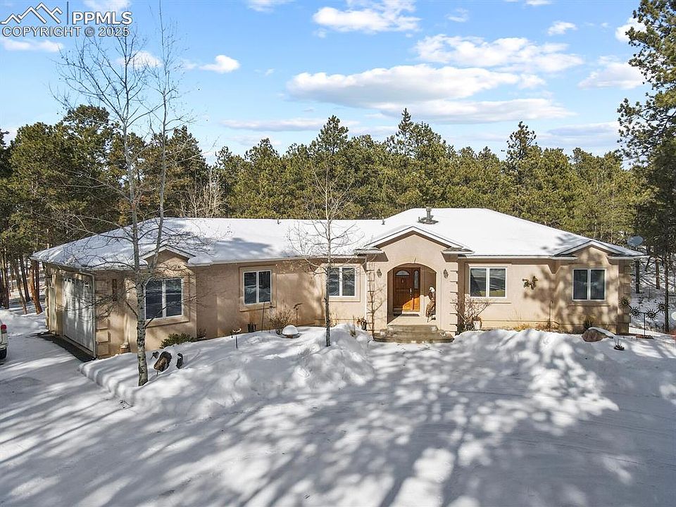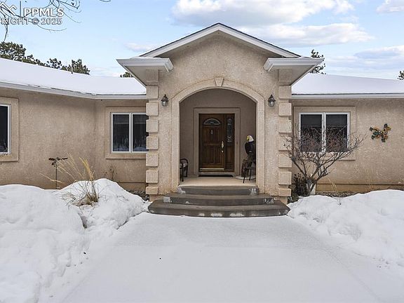 Discover the perfect blend of comfort and seclusion in this well-maintained 5-bedroom walkout ranch style home, nestled on 5.27 acres filled with gorgeous Ponderosa Pines. This inviting home features a bright and airy main-level great room, which is seamlessly connected to the open kitchen—perfect for entertaining and everyday living. The kitchen has been updated & is complete with modern finishes and ample storage. There is plenty of seating at the large quartz island or in the adjacent breakfast nook, surrounded by bay windows. The main-level primary suite offers convenience as well as privacy with hardwood flooring, attached 5 piece bath, walk-in closet, & direct access to the deck through french doors. A separate formal dining room, office with french doors (which could be used as a bedroom with a huge walk-in closet), laundry room with updated cabinets & soaking sink, as well as a full bath complete the remainder of the main level. The walkout lower level provides additional living space, ideal for entertaining or multi-generational living. The family room features a gas fireplace and has plenty of windows for natural lighting. There are 4 additional bedrooms and 2 bathrooms ( one is a Jack and Jill ) on the lower level so there is plenty of room for all your needs. Additional features include a stucco exterior for low maintenance, wood casement Pella windows, 2 furnaces, newer 55 gallon water heater, invisible fence around perimeter of the house ( approx. 1 acre), and a fully finished, heated garage. Located in highly desirable Lewis Palmer D-38 & right around the corner from Monument Academy East Campus. See Interactive Virtual Tour. Experience peace and tranquility in this secluded retreat, surrounded by nature yet just minutes from town. A rare find—don’t miss this opportunity!