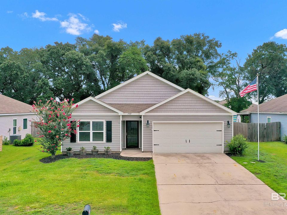 Welcome home! This 4-bedroom, 2-bathroom Gold Fortified home is nestled Hidden Lakes Subdivision. This home features a spacious open floor plan, making it great for entertaining or everyday living. The thoughtfully designed split bedroom layout provides privacy, with the primary suite tucked away from the additional bedrooms. It includes a ensuite bath with double sinks, a soaker tub, a walk-in shower, a private water closet, and a generous walk-in closet. At the heart of the home is the kitchen, complete with an oversized island that seats four, offering ample counter space. Step outside to enjoy the extended 10x15 screened-in patio, great for relaxing mornings including an additional open patio for grilling and outdoor dining and a fenced backyard, which backs up to a tree line, providing privacy. Hurricane fabric window shields come with the house and are specific to each window. Located in Hidden Lakes Subdivision, this home is part of a community that has incredible amenities, including a pool, tennis, basketball, and pickleball courts, grill pavilions with sinks, sidewalks with streetlights for evening strolls, and picturesque ponds for fishing. Conveniently located near shopping, dining, and entertainment, and just a short drive to the white sandy beaches of the Gulf Coast, this home truly offers the best of Foley living. Buyer to verify all information during due diligence.