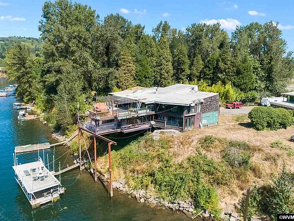 80 ft of Willamette River Frontage across from the old Yacht club. This is .71 acres, with a large dock out in the water to tie up your water crafts to. The views are a birds eye view of the Willamette River. There is a large shop/garage with 18 ft wide roll up doors and one single. Above the garage is a studio apartment with kitchenette and washer/dryer. Home has steel beams supporting the footing of the home as well as steel beams running thru the home. AS-IS.