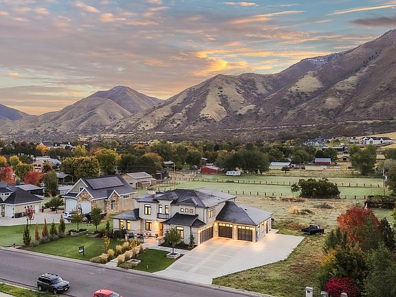 Experience elevated living in this Mapleton luxury estate, where craftsmanship, comfort, and creativity meet. This home sits on a generous lot with mountain views, this home showcases custom metalwork by local artisans and exceptional finishes throughout. Inside, you'll find a spacious open floor plan with a gourmet kitchen, vaulted ceilings, and a great room filled with natural light. The main-level primary suite provides a peaceful retreat with a spa-inspired bath and private access to outdoor living. Downstairs, enjoy a home theater, indoor basketball court, and expansive entertaining spaces designed for connection. The exterior is partially completed, allowing the next owner to personalize the landscape and outdoor living areas to their taste. Located in one of Mapleton's most desired neighborhoods, this home is a rare opportunity to own a residence that blends art, architecture, and lifestyle.