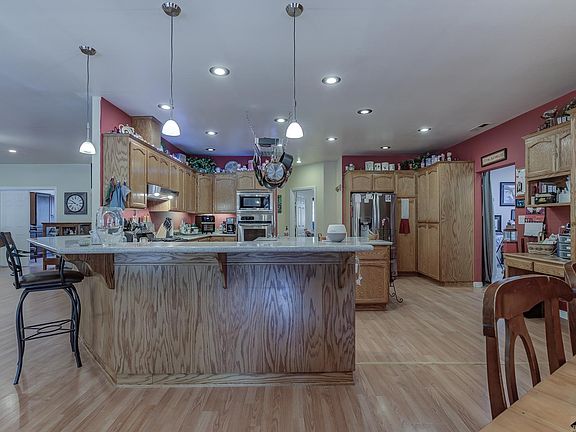 Main house has 5 bed/4 bonus rm/3.5 bath. 3,774 sq ft. The main house enters into the 24x30 sq ft great room, there is a free-standing wood stove and 3 large windows that open out to the back patio and yard. The great room flows into the dining area and then into the beautiful, open kitchen. The kitchen features a large eating bar, solid counters, custom cabinets throughout, many with pull out shelves and some large drawers perfect for pots and pans, also a built-in pantry and a built-in desk. The free-standing island features a hideaway pull out for a stand mixer, also a mini sink and electrical plugs all around. There is a free-standing propane range as well as a built-in oven and microwave. The master suite is off the great room, with a walk in closest and a standard closet. The master bath has a jacuzzi tub for 2, a large shower, 2 vanities and an enclosed toilet room. In addition, there is an office with French doors and a TV room, a bedroom and a bathroom, located on the 1st half of the house. The 2nd half of the house features 3 bedrooms with bay windows, 1 bath, a central gathering area, a bonus room and a sm. Appliance/food pantry that can be converted back into a ½ bath. The bathroom has 2 vanities and an enclosed toilet/bath area. This room also features Disney inspired murals throughout. There are laundry hookups in the 2-car garage as well as in the house. This house has solar. The 2nd house is 2 Bdr/2Bath, 1200 sq ft with an enclosed porch as well as covered deck made of a trex like material. The kitchen features an island/eating bar with custom cabinets all throughout. The living room has vaulted ceilings of knotty pine. The master suite has an alcove/office and a bath which features custom cabinets and a jacuzzi type tub. This house has an extra-large garage and a fenced in backyard with garden areas. All buildings are one level. A 30x40 shop building features a studio living area, RV rollup door, plenty of storage area and a