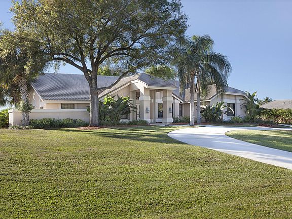 Premium lakefront one acre estate lot, 4 bed, 3 baths plus den and billiard room. Large family room with fireplace and wet-bar. Updated kitchen and newer roof. Over 4,200 +/- square feet under air, 5,300 +/- total square feet. 186 feet of lake frontage. LocationFieldbrook Circle East, Boca Raton, Florida. In central Boca Raton, Fieldbrook Estates is an intimate gated enclave of only 54 one-acre estates surrounding a shimmering 14-acre lake in private serenity.PropertyLooking west on 186 feet of wide shoreline, this distinctive contemporary estate sits on a prime lakefront property with sweeping lawns, mature trees, privacy hedges, and gardens. The open-plan interiors connect to the skylit lanai, a true outdoor living space by the beautiful lakeside pool patio.ResidenceDesigned to capitalize on the lake view, this comfortably sized single-story residence totals 5,300 square feet with four bedrooms, three full baths, and a side-entry two-bay garage. Clean-lined architectural elements define each space in the bright and airy open layout. High ceilings add to the sense of spaciousness, and neutral-toned marble floors flow throughout most rooms. The inlaid-marble foyer enters the lakeside living room brightened by a window wall along the lanai. A vaulted ceiling highlights the open formal dining room that shares the lake view and also overlooks the front garden. Equipped with stainless steel appliances, the custom gourmet kitchen has granite counters incorporating a wraparound bar counter. Glass doors open to the lakeside lanai from the vaulted breakfast area and billiard area served by a walk-in wet bar with a pass-through window to the patio. This space is also open to the step-down family/media room appointed with a sleek fireplace and custom built-in cabinetry. The office/library off the foyer. Opening to the lanai and lake view, the spacious bay-windowed master wing features a private bath with walk-in closet. Separated from the master quarters, three more bedrooms are served by a bath that doubles as the cabana bath.