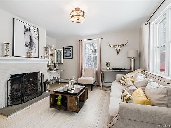 Not to be missed! This unique cape is filled with charm galore. Updated with style and interesting touches from top to bottom! Updated kitchen and baths. Enter from the front door into the gorgeous living room w/ working fireplace; family room/dining room to the left opens to the office w deck which could be easily converted to a first floor bedroom w/ full bath. Second floor boasts pine flooring; two to three bedrooms with beautiful bath, double sink, with lg walk in shower. Master bedroom with vaulted ceiling and beams is over-sized with plenty of closet space. Large movie screen hidden in beam w projector stays. Second bedroom upstairs could be divided into two bedrooms and owner may be willing to address. Fabulous party barn adds additional space for entertaining. Side entrance to original milking stalls. Won't last!