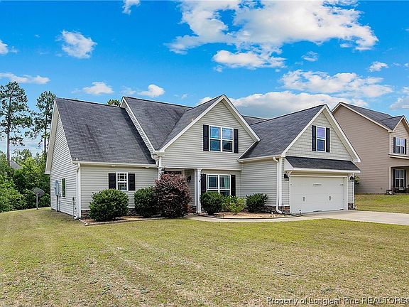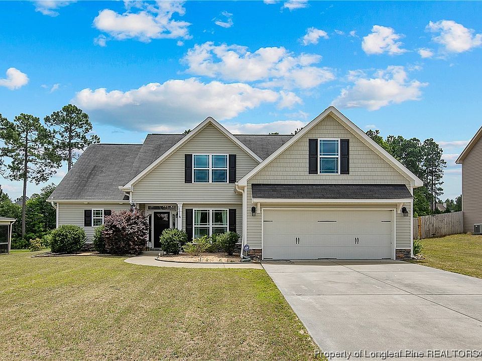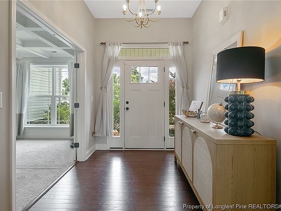 This beautiful 4 bedroom/3 bath home in the desirable gated community of Carolina Lakes is located on a quiet cul-de-sac with a view of the lake. Truly a unique find, there are two bedrooms and two full baths located on the first floor, which includes the owner's suite with double sinks, separate tub, tile shower and a spacious walk-in closet. The second bedroom downstairs is on the opposite end of the house, with a walk-in closet and full bathroom. Upstairs has a large bonus room, with two additional bedrooms and a full bathroom. The open kitchen has stainless appliances, an island, a breakfast area and opens onto a patio leading out to the large backyard with fire pit. Enjoy a view of the lake from the front dining room or office, with French doors and lovely coffered ceilings. The laundry/pantry is conveniently located off the kitchen and as you enter from the 2-car garage. A must see! Amenities include lake access, community pool, tennis courts, walking trails and so much more.