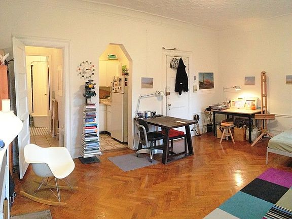 176 Clinton Avenue, Brooklyn, NY Classic studio apartment in Historic Clinton Hill Brownstone. Entrance features classic English garden with many interior details including original quarter sawn oak, wainscot and walnut bordered hardwood floors. The apartment has 10' tin ceilings, herringbone hardwood floors and an ornamental fireplace. There are three arched windows over the copper bay window on building facade. Separate kitchen and bathroom with full tub. Heat and hot water is included. The building has been restored to perfection. Bike Storage. NO DOGS. There is NO FEE. For more information or to set up a viewing, please contact Jesse Evans