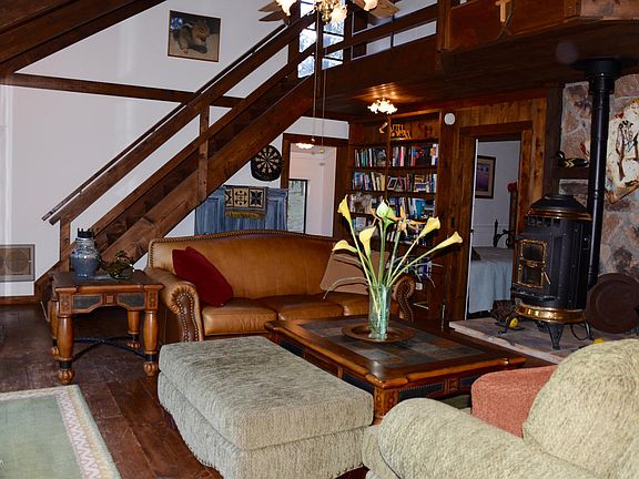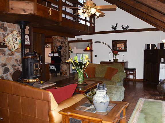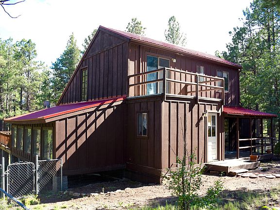 Mountain hideaway surrounded by ponderosa pines on 10.18 acres. Modified salt box home comes furnished. 3 BR & 2 BA with an open floor plan with cathedral ceilings and balcony in the great room. 2300 sqft. Large deck in back of home with a covered deck in the front that connects to the master BR. Upper level deck connects to upstairs BR. Adjoins other large parcels. Unfinished out building is ideal for a shop, studio, or guest apartment.