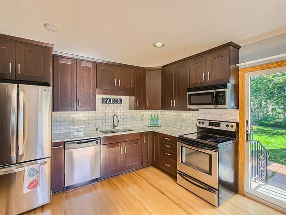 Available for the first time ever! This home has been passed down through multiple generations of the same family over the last 70 years & their love for the home & pride in ownership is apparent throughout. The home also offers the perfect combination of vintage & modern features. The main level includes original hardwood floors, a fully remodeled kitchen with quartz counters, tile backsplash & stainless appliances, spacious dining room with large front picture window, living room & office. The upper level features an ideal layout with three bedrooms, including a primary with two closets, & a large separate walk-in closet, as well as an updated full bath. The gorgeous lower level includes a family room with built-ins & surround sound system, gas fireplace, bar area & 3/4 bath with heated tile floors - perfect for movie nights or entertaining guests. Brand new exterior doors. Mature trees & patio. Oversized 2-stall garage. Convenient location near both downtowns. Quick close possible!