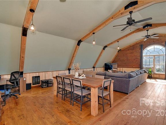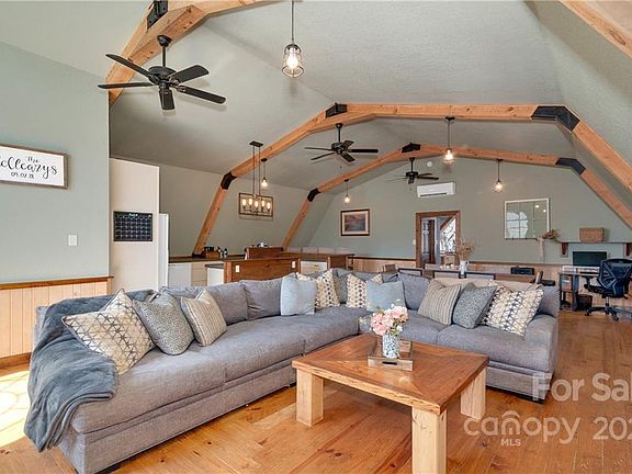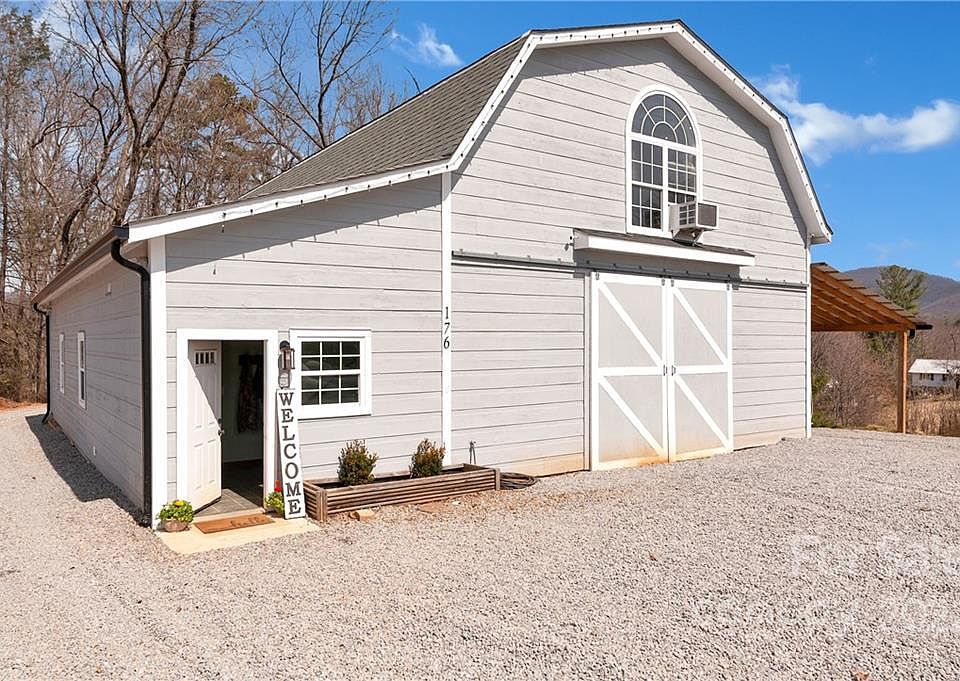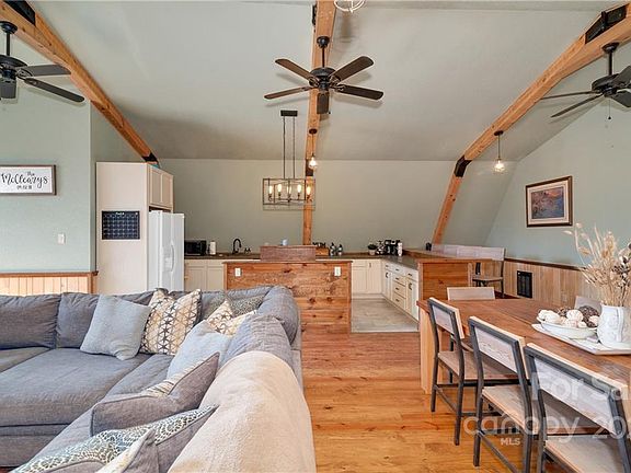 Character and Convenience! Renovated in 2019 this home, minutes from Haywood regional medical center/fitness center & Lake Junaluska, offers easy access to Waynesville, Asheville & Sylva. Living space boasts lofted gambrel ceilings w/ huge open family room marked by soft pine floors, wainscoting on walls & ample light. Kitchen features poured concrete counters, soft close cabinets, 4 person island & walk-in pantry. Bedroom showcases a stunning picture window, double vanity bathroom & huge walk-in closet. Main level is an enormous shop w/ double 400 amp service 11x12 ft barn doors, pine walls & extra storage rooms; perfect for a workshop, home studio, multiple vehicle garage or whatever your heart desires! Driveway is newly graveled, gutters & exterior paint are new w/in the last year & metal roof on attached structure is new. Attached Lean-to offers space for additional vehicles or camper! All custom furnishings negotiable w/ sale. Come see this unique property, it won't last long!