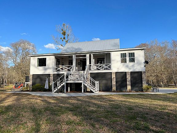 This private hideaway features a beautiful custom designed home built in 2019 on 3.5 acres of deep Edisto River waterfront property. Owners personally customized the design, layout, and all interior and exterior features - truly one of a kind! Home is elevated on CMU piers, wrapped in historic Charleston style brick, with louvers and 4 garage doors that enclose the 2,640 sq/ft drive-through garage. This country home offers an airy, sunny, open living space with three sets of french doors lining the back of the house to showcase the waterfront view. The main living area features a propane vent-less fireplace surrounded in matching historical Charleston style brick and shiplap that extends to the peak of the vaulted ceilings accented with reclaimed barn wood beams. All countertops throughout have been upgraded to solid stone, aside from the hickory butcherblock island. Master bathroom features matching his and hers vanities, Italian Marble tile floor and shower, and a cast iron clawfoot tub underneath a chandelier for a glamorous feel. Spacious covered porches on the front and back of the home offer serene sunrise and sunset views over the water. The completely renovated and upgraded dock, along with all of the other outdoor amenities this property provides, allows for a 'staycation', every day!
