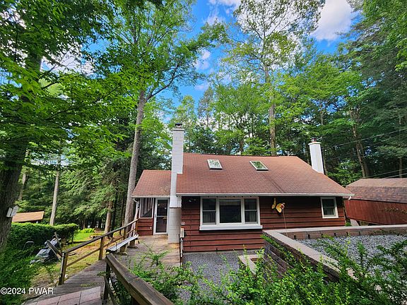 Charming Chalet style home is just a hop skip and a jump to Lake Wallenpaupack. Boat slips are available through the community. With the high wood ceilings and wood beams, this home is warm and inviting. There are 2 bedroom, 1 full bath and a loft for extra sleeping areas makes this the perfect vacation spot! Enjoy coffee or great late night entertaining in the screened in porch which also leads to a large deck in the back. Cozy up to the wood burning fireplace in the living room on those chilly nights. There is a shed to keep all your water toys in or use the full basement for all your storage needs. Located right off 507 and Tafton exit on 84 that makes this home an easy spot to enjoy for a weekend or full time resident.