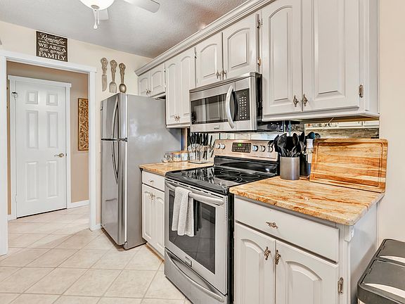 Updated eat-in kitchenModern cabinetryGranite countertopsSleek stainless steel appliancesOpen-concept layoutPrivate patio
