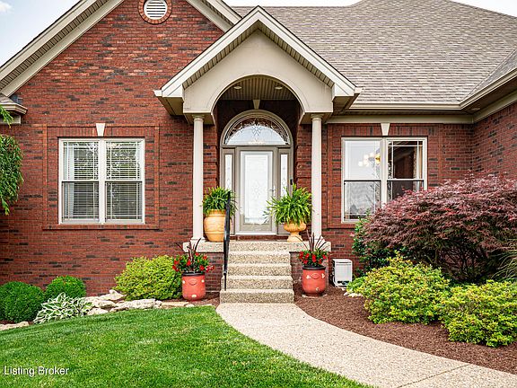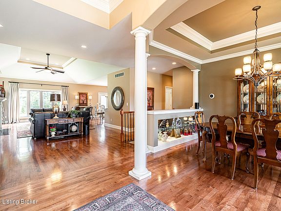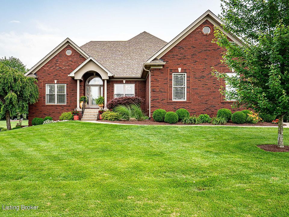 Welcome to this stunning 5-bedroom, 3-bath walk-out ranch nestled on a beautifully landscaped 1-acre lot in the highly sought-after Goebel Crossings subdivision, within the Spencer County School District. Step into the high ceiling foyer and hardwood floors that flow throughout the main living area. The open-concept layout offers seamless flow between the living room, dining area and kitchen—ideal for everyday living and entertainment. The formal dining room adds a touch of elegance to special gatherings. Easy access to the large deck and screened in area add to casual outdoor living. The open staircase to the lower level lends an airy feel to the main floor and capitalizes on the abundant natural light. Cozy up to the tiled, gas fireplace in the living room or gaze at the view of . . . of the large backyard. The primary bedroom is a true retreat, with access to the screened-in deck area for morning coffee or evening relaxation. The ensuite bathroom features granite countertops, a double sink vanity, jetted tub, water closet, walk-in shower, and a large walk-in closet with convenient passthrough access to a spacious laundry room. The guest bedrooms are on the side of the home and share the guest full bath. One of the guest bedrooms has glass French doors and currently serves as a private office. Downstairs, the fully finished walk-out lower level is perfect for multi-generational living, complete with a wet bar area that can double as a kitchenette, a large living space, and a private no-stair entry. Both lower-level bedrooms have large walk-in closets. Enjoy outdoor living in the level backyard with beautiful landscaping, a fire pit area, and plenty of space for recreation or relaxation. Don't miss your chance to own this rare gem offering space, functionality, and location all in one!
