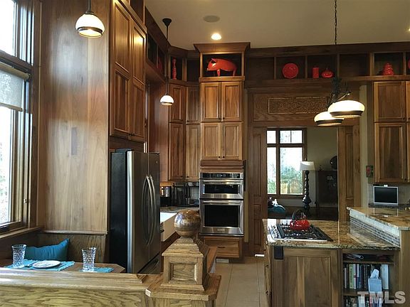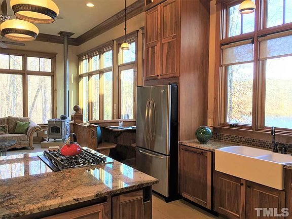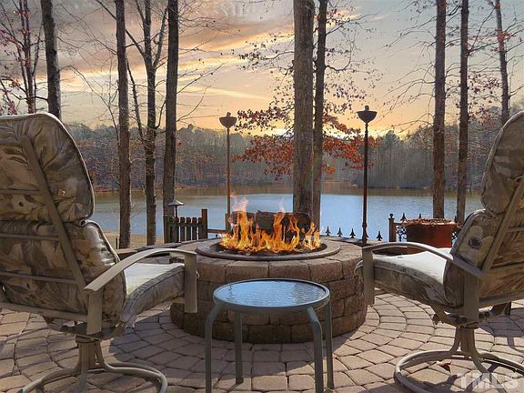 Stunning retreat nestled on serene lake. 14 private acres. Lovely 1st flr MBR suite w/lake views, 2nd flr meditation rm w/built-in bed, 2nd flr 3 season rm. Sun rm & family rm w/lake views. Gorgeous kitc w/blk walnut cabinets, granite Elegant detailing & fine craftsmanship in every rm. Multiple entertaining options: Main level terrace,lower stone patio, screened porch, cvrd front porch. Outdoor Jacuzzi for ultimate relaxing. Private dock for trophy bass lake access. Landscaped. Commute to the Triangle.