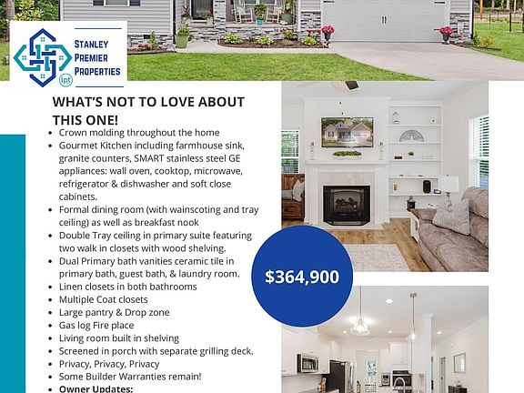 Second chances don't always come around but this time it works out in your favor! Back on the market due to buyer situation! Come take a look today! Welcome to this picture-perfect ranch, nestled on the largest lot in one of the area's most desirable neighborhoods. 2.36 Acres of privacy. From the moment you step inside, you'll see exactly why the current owners fell in love with it—from elegant finishes to thoughtful design touches throughout. Crown molding wraps every room in classic charm, while the gourmet kitchen is a true showstopper. Featuring a farmhouse sink, granite countertops, smart GE stainless steel appliances (including a wall oven, cooktop, microwave, refrigerator, and dishwasher), soft-close cabinets, and a spacious pantry—this kitchen is ready for your next culinary adventure. The formal dining room shines with wainscoting and a tray ceiling, while the breakfast nook offers a cozy, sunlit spot to start your day. The living area centers around a gas log fireplace, flanked by beautiful built-ins—ideal for displaying your favorite pieces. The primary suite is a true retreat, with a double tray ceiling, dual walk-in closets with custom wood shelving, and a spa-like bath boasting dual vanities and ceramic tile floors. Guests will enjoy equally thoughtful touches, with a second full bath and linen closet, plus a spacious laundry room featuring more ceramic tile. A functional drop zone, coat closet, and screen porch leading to a grilling deck complete the package—but the real star is the privacy this lot offers. You'll have room to spread out, entertain, garden, or simply unwind in your own private sanctuary. Don't miss the rare combination of charm, quality, and outdoor space this home delivers!