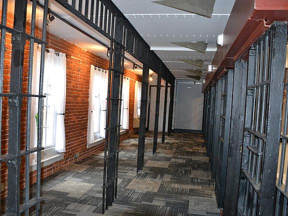 Originally converted into a theme restaurant and residential space in 2001, this second-floor unit features preserved elements from the original jail including an original jail cell maintained in its historic condition, slate flooring, and iron bars incorporated into the design.